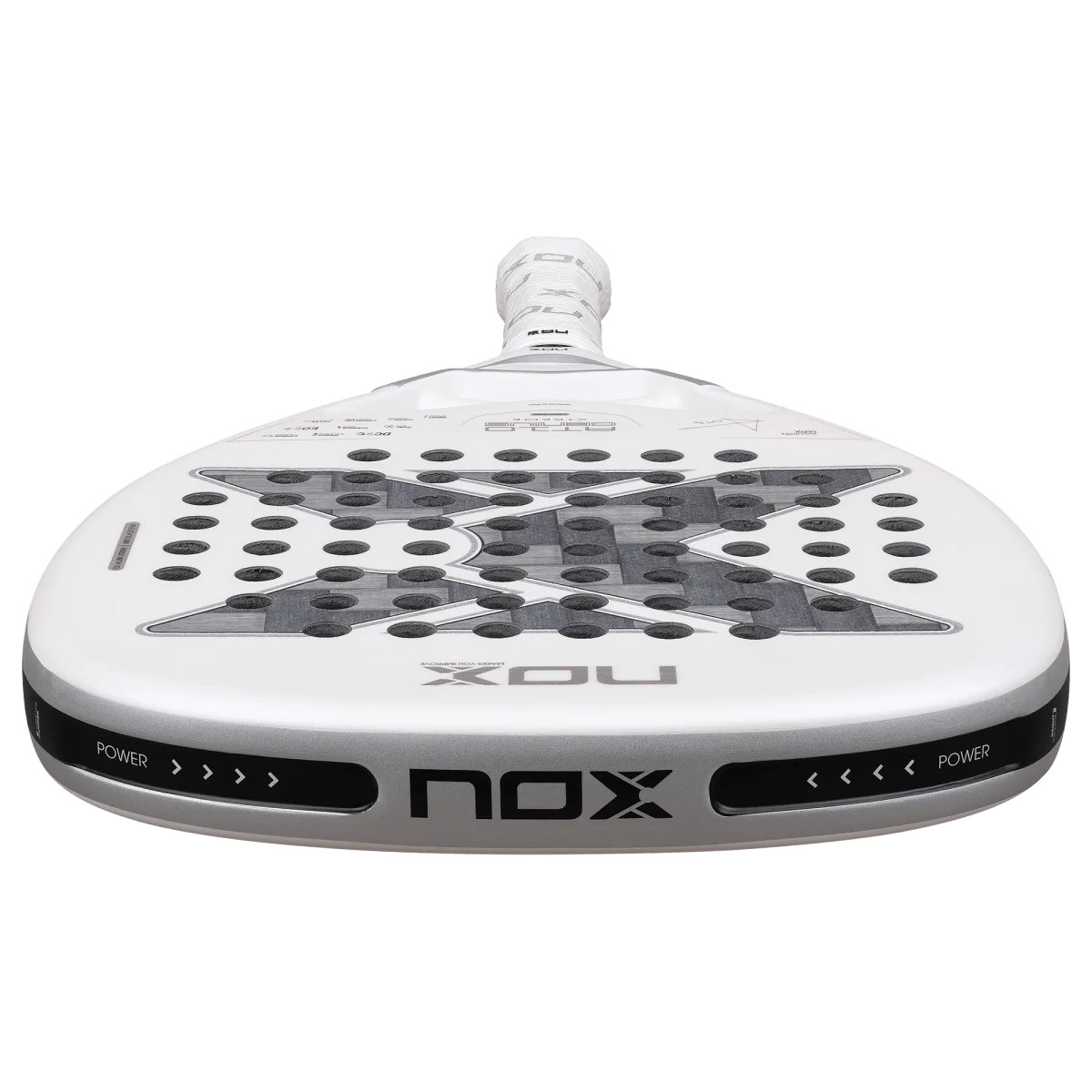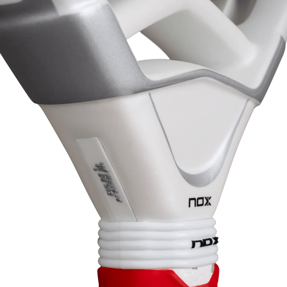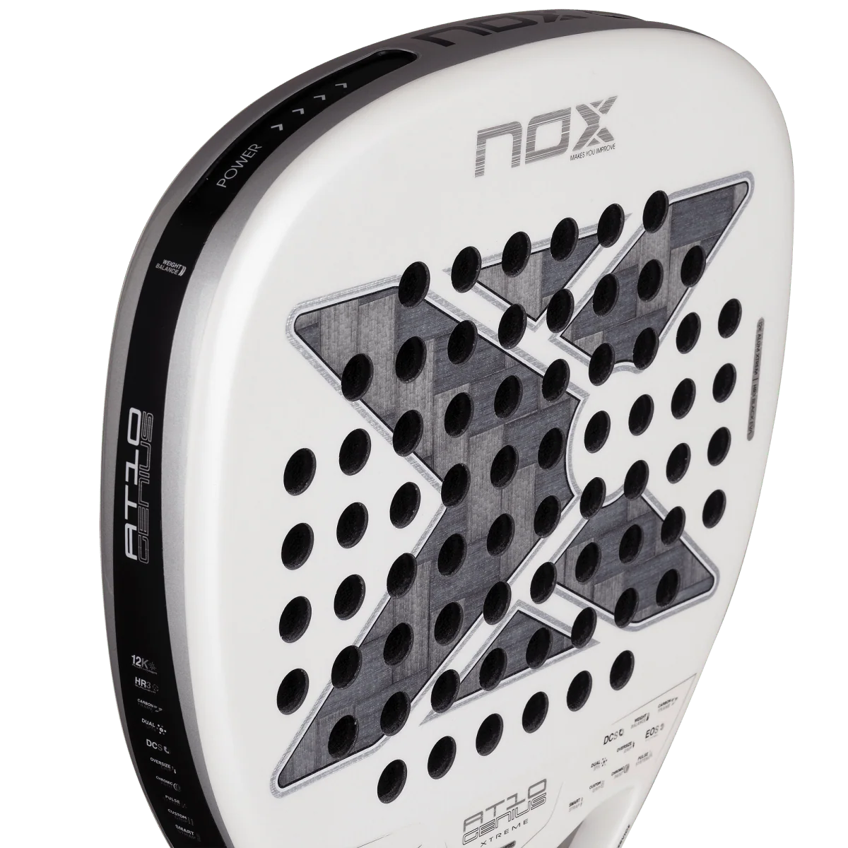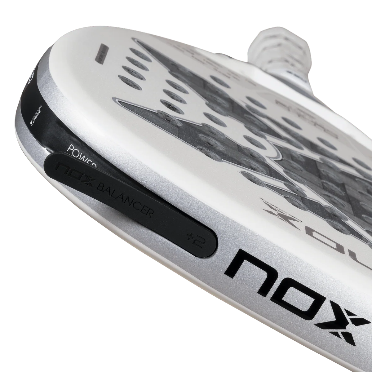 Its diamond shape, high balance and longer grip offer offensive play without compromising control. It features the key innovations of the new AT10 collection: the Weight Balance counterweight system, allowing personalised racket balance, Photochromic Paint reactive finish and the Dual Spin surface, which enhances spin generation. In addition to a redesigned mould, it debuts the new 12K Alum Xtrem Carbon, an exclusive NOX development that provides greater stiffness, a finer and more uniform surface, increased durability and stable performance even under extreme temperature changes.