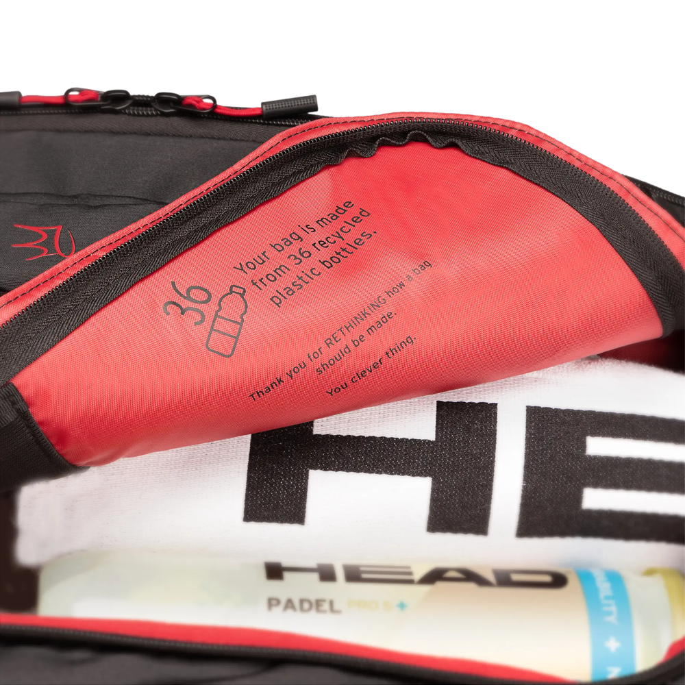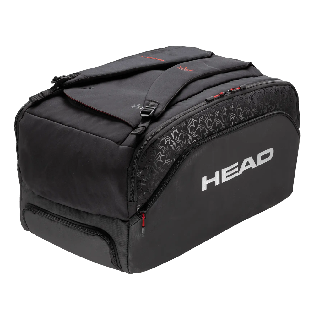 Exclusive, elegant style – including some personal touches – from ‘King Coello’. Part of the Arturo Coello collection, the COELLO PRO X PADEL DUFFLE BAG L was designed and developed in collaboration with the world number one. Created from fabrics containing recycled PET bottles, this bag will appeal to the eco-conscious and the style-conscious; his crown logo on the side has a glossy finish and elevates the look. The silver HEAD logo adds style and contrast, standing out against the black, and the personal touches include the choice of red – one of Coello’s favorite colors – for the inside of the bag. Crown logos on the straps also enhance the distinctive, premium appeal of a bag that Coello’s fans will adore.