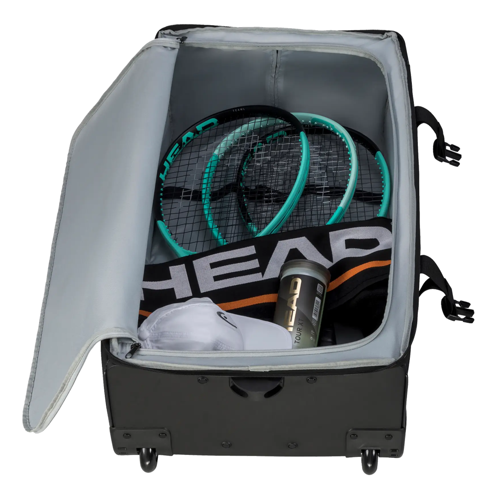 When you are on your way to your next tournament, you want to travel in style and the TOUR TRAVEL BAG 110L BK lets you do just that. Along with a new design, a contemporary shape and plenty of space, the bag comes with modern, robust functionality to make traveling easy. A stowable telescope handle means you have the option of pulling the bag to the airport departure gate, or you could carry it using the top handles. The bottom and edge protection helps to keep your belongings safe when you’re on the move.