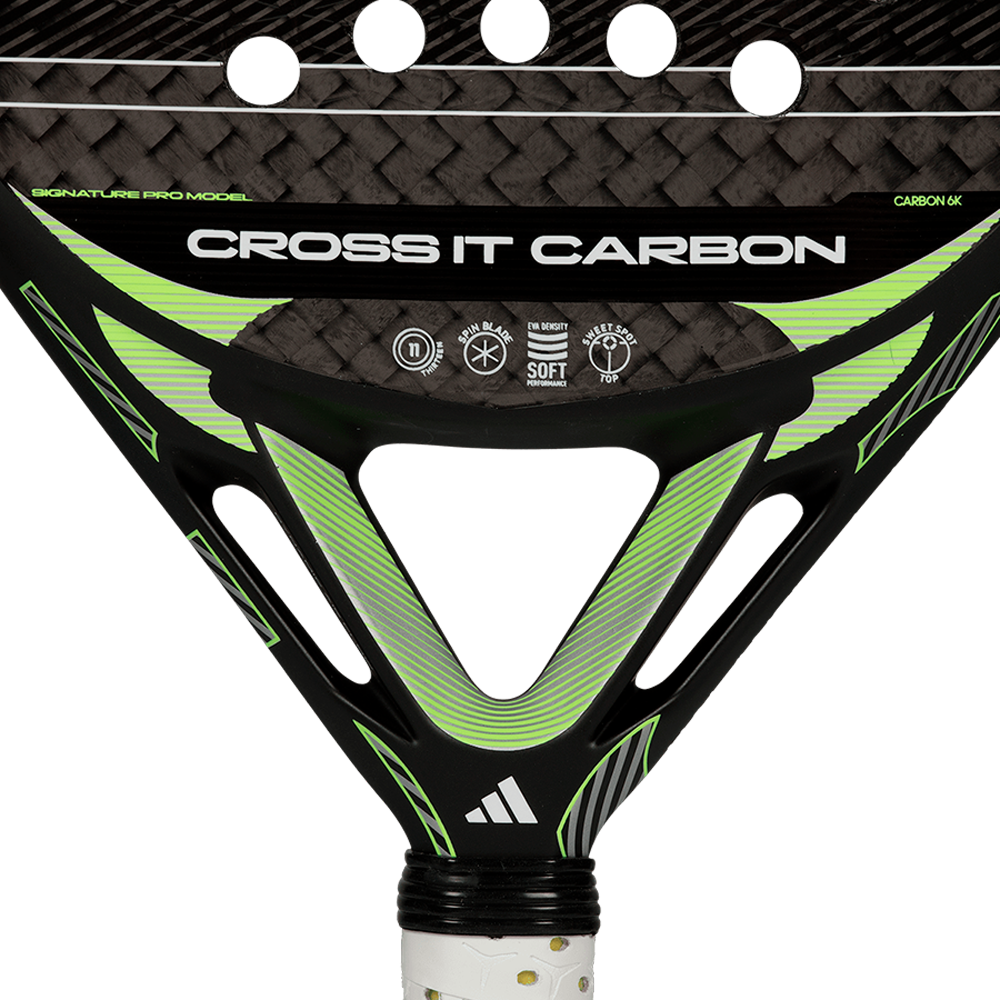 The adidas Cross It Carbon 2026 padel racket is made for players who want to hit harder, move faster, and feel total confidence in every shot. Dynamic Air Flow technology accelerates your swing, while the Extra Power Grip increases inertia for effortless, powerful finishes. The 11 Thirteen hole system adds stability and durability to every impact, and Spin Blade Decal enhances spin for more creative, controlled shot-making. Its Soft Performance EVA core offers great ball output and a smooth feel, while the 6K Carbon surface adds stiffness and precision for dominating rallies. The Diamond Oversize shape raises the power potential and expands the hitting area, making the racket more forgiving and ideal for offensive-minded players. Built for high-level performance, it delivers the strength, comfort, and responsiveness needed to take control of the match