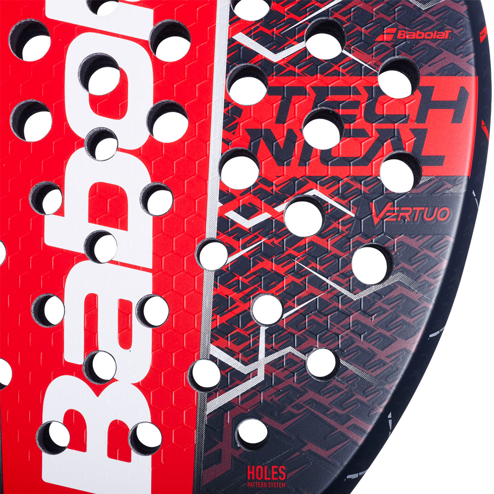 Optimized distribution and size of holes specific to each racquet shape optimizes power transmission and increases precision when returning shots.
