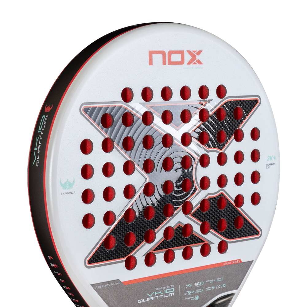 The new VK10 Quantum 3K shares with its sister ML10 Quantum 3K the 3K carbon fiber and the classic NOX HR3 rubber, with the addition of the Eva color change. A “plug and play” racquet that is easy to adapt, with an intermediate feel characteristic of NOX racquets and in a weight range between 350 and 365 grams.